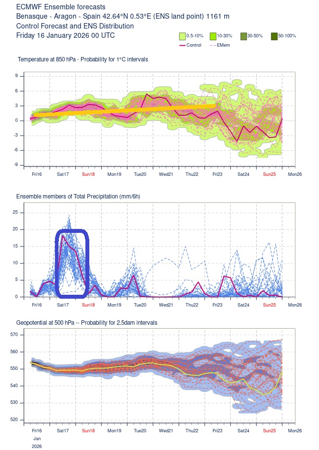 Las plumas del ECMWF nos dejan ver como las temperaturas, tanto a 850hpa como a 500hpa, no van a tener grandes cambios. Serán estables, más o menos, unos cuantos días, lo que nos indica que, a falta de ciclogénesis, la cota de nieve no variará mucho, bajando hacia los 1.300msnm a veces, igual incluso algo más bajas, pero más bien rondando los 1.5000msnmm durante unos cuantos días. Las precipitaciones se esperan persistentes y de intensidad moderada durante el sábado y madrugada del domingo. Luego serán más débiles, quizás con algún frente más hacia los primeros días de la semana que viene, pero ya veremos.
