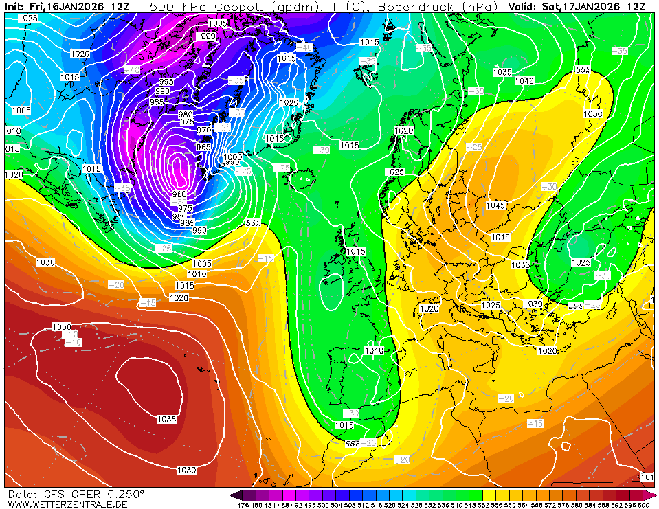 Así lo ve el GFS par mañana sábado por la tarde. Con esa vaguada en altura, la -30ºC a 500hpa (unos 5.500msnm) llegando el Golfo de Cádiz, y cierta baja cerrada en superficie. Flujo de S y SE en superficie, sures en altura sobre el Pirineo rondando en ese momento la -25ºC a 500hpa.