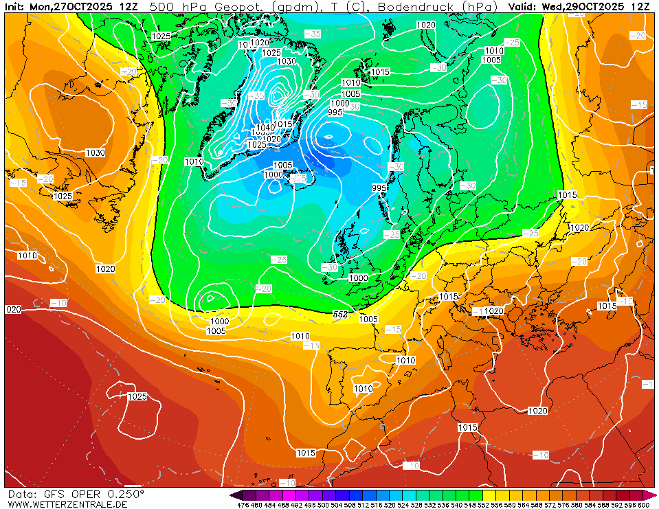 Así lo ve el GFS para el mediodía del miércoles, momento más activo a la vista. Con una vaguadilla en altura acompañando al frente que irá barriendo, de W a E la Península. Cierto flujo de SW en todos los niveles, lo cual ayudará a reforzar el efecto orográfico del Pirineo, cosa que no se aprecia igual, por el momento, en siguientes frentes, más «aponentados».