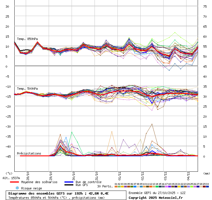 Tal como se ve en el ENS del GFS, con las líneas de temperaturas muy estables, tanto a 850hpa, como a 500hpa. En la de precipitaciones, que se anima algo el miércoles, especialmente hasta mediada la tarde, pero luego marca frentes que, si no medida cambio en la previsión, dejarían muy poca agua.