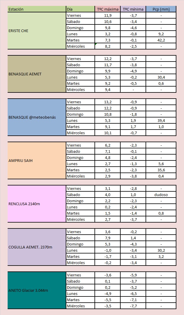 Máximas en descenso, desde el cálido fin de semana, a valores más normalizados. pasando de superar los 10ºC en los pueblos a estar entre 5ºC y 8ºC. Mínimas en general con algunas heladas, más o menos frecuentes a todas las cotas, pero lejos de ser importantes.
