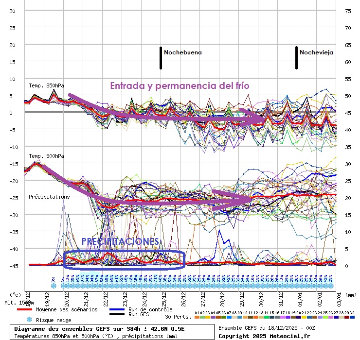 Y así lo plasma el ensemble del GFS. Con descenso de temperaturas el fin de semana, coincidiendo, desde le sábado, con la mayor posibilidad de precipitaciones, hasta el entorno de Navidad. Mantenimiento de temperaturas frías, tampoco exagerado pero si que por debajo de lo habitual, sine díe. Siempre pillándolo con precaución conforme más nos alejamos, tanto las temperaturas, como las precipitaciones, ya que estas bajas aisladas dependen mucho de dónde caen al final y como les puede entrar algo de aire frío en altura que les dé más vida.