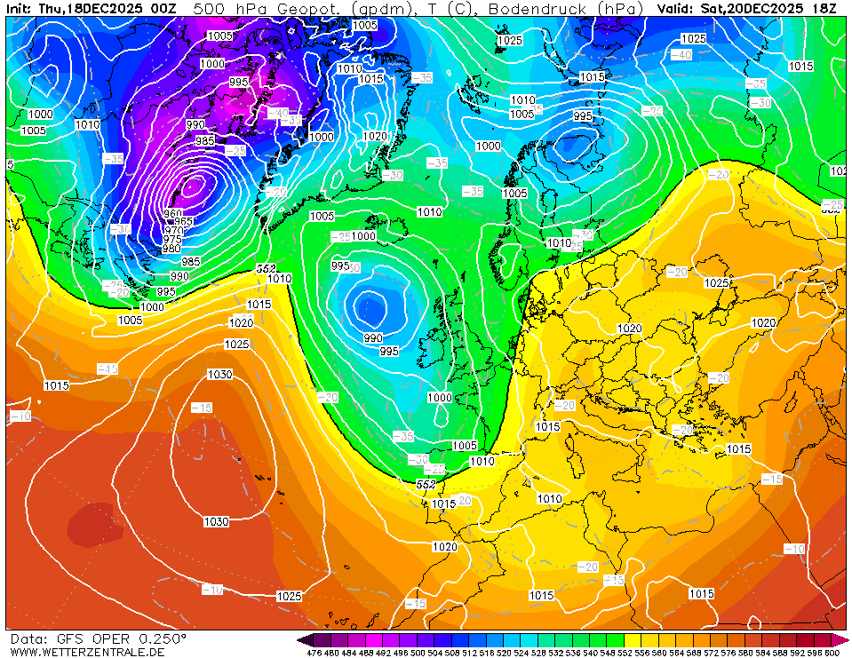 Así lo ve el GFS para el final del sábado. Ya tenemos la vaguada entrando en la Península, y la tendencia posterior es a que vaguada y borrasca continúen hacia el Sur, acabando por desgajarse y quedando días y días dando vueltas por nuestra zona. Habrá que ver cómo evoluciona, cómo se configura, las retroalimentaciones, si entra más aire frío, etc, etc, etc… Eso sí, la coincidencia de los modelos es que habrá varios días inestables y tendencia clara a situación más fría de lo habitual para las fechas durante bastantes jornadas.