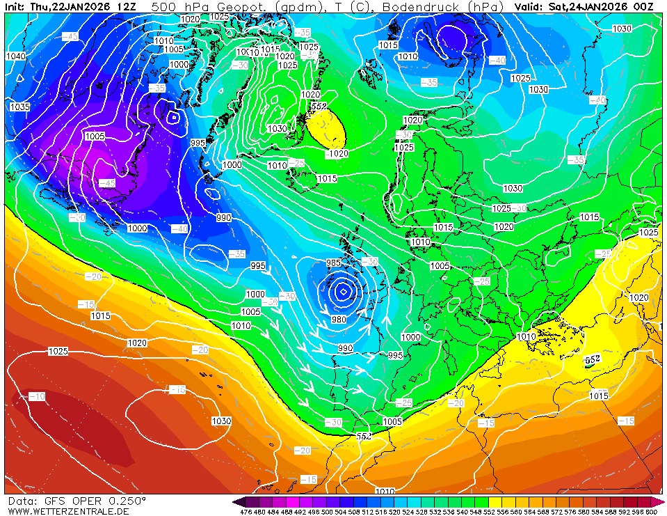 Así estará la cosa justo cuando cambiemos de viernes a sábado. Una potente baja de unos 965mb en su centro pululando por el Sur delas Islas Británicas, afectado a buena parte de la fachada atlátnica de Europa, también a España, que quedara barrida por sus frentes.