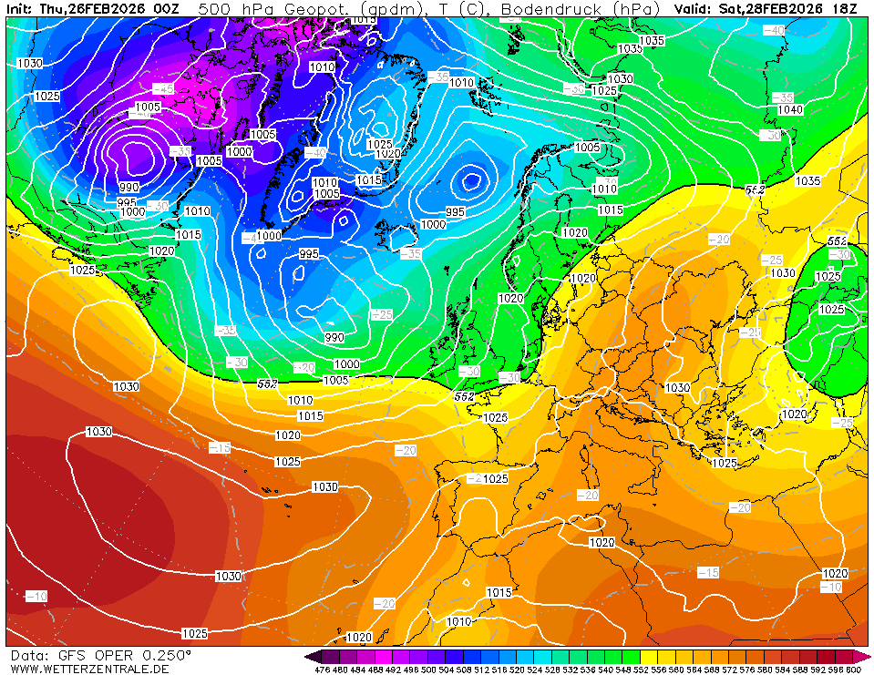 Así lo ve el GFS para la tarde del sábado. Con una pequeñísima vaguada rozando el Norte de la Península, llevando consigo el débil frente asociado que comentábamos anteriormente. En cuanto pase ese frente, ya el domingo, las altas presiones volverán a dominar claramente, estabilizando de nuevo la situación.