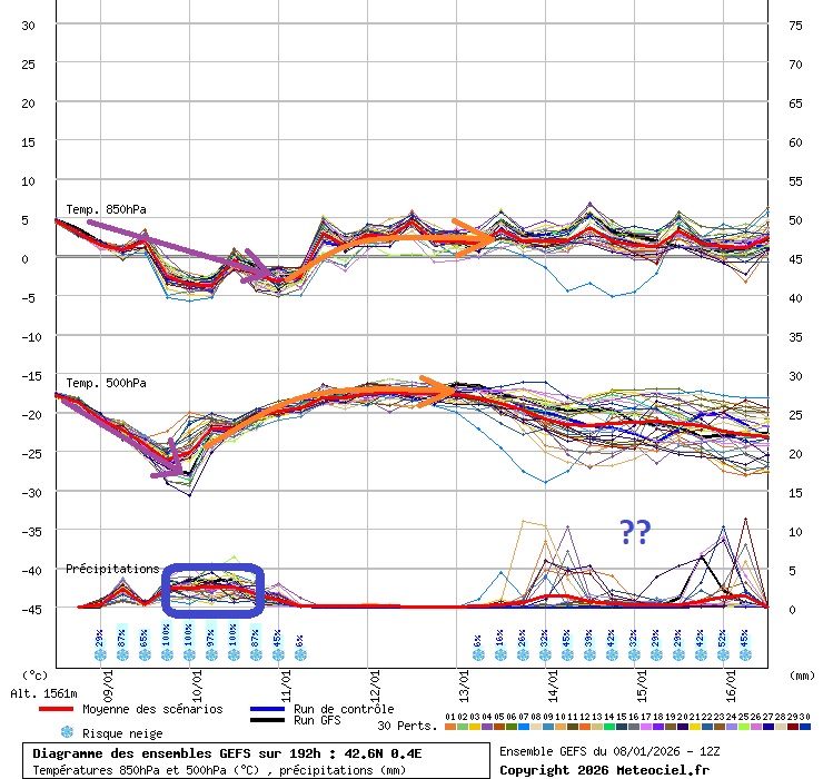En el ENS del GFS vemos: El descenso térmico asociado a la llegada y el paso de la entrada de NW y el frente. Como el frío en altura pasa antes que en superficie, ya que la descarga de Norte seguirá metiendo frío aunque la dorsal vaya entrando en altura. Vemos las precipitaciones del viernes por la tarde y, sobre todo, sábado en la primera mitad del día. Luego recuperación térmica, a valores similares a los de hoy jueves, y ya veremos si entran más frentes en días siguientes. De momento el domingo e inicio de semana parecen poco probables las precipitaciones.