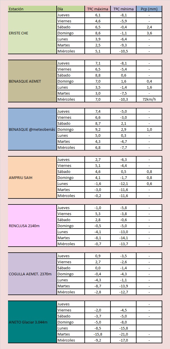 Viernes día 9: De madrugada y primeras horas, poco nuboso. A lo largo de la mañana se tapará desde el Norte, pudiendo precipitar, más probablemente conforme avance la tarde. Cota de nieve a unos 1.500msnm, bajando rápidamente a cualquier cota. Veremos si la nevada salta bien la divisoria durante la tarde y la noche y puede dejar una bonita nevada. Temperaturas más bajas. Mínimas a última hora de la jornada. Vientos de NW flojos en valles, más sensibles en cotas altas, donde podrían acabar muy fuertes.
