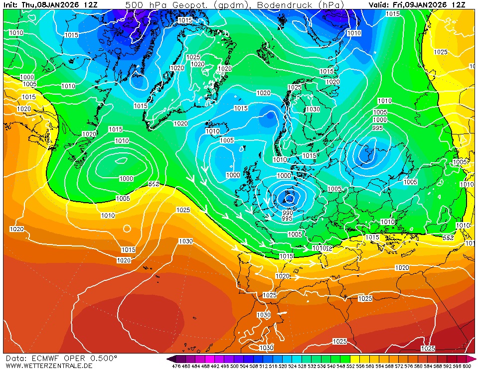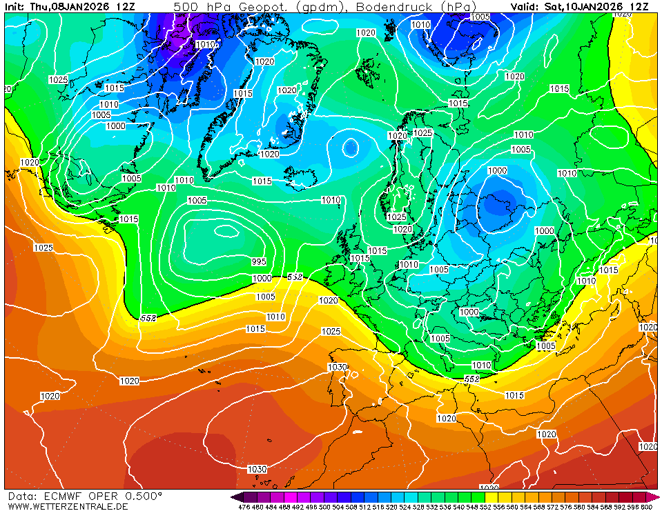 Así lo ve el ECMWF para la tarde-noche del viernes, con la entrada de NW a las puertas, con largo recorrido marítimo. Irá avanzado hacia el Sur a la vez que se desplaza hacia el Este dejando, ya la tarde del sábado, una situación más de Norte que de NW.