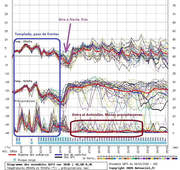Continuamos con el paso de frentes, día sí, día casi, o día también. Seguimos acumulando espesores de nieve generosos, sobre todo a partir de 1.500/1.600msnm. Continúan las temperaturas bastante normales, frío no hace, no tenemos, no hemos tenido, ninguna ola de frío en lo que va de invierno, y no se ven en el horizonte.